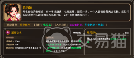 第三位是花四娘,他是无名客栈的老板娘,有一手好厨艺玩家通过前往客栈来触发初次对话,在后期也会遇到泼皮来客栈闹事,将泼皮打走后,窗外的黑影进行对话,完成任务,结束战斗可邀请花四娘,解锁花四娘的“钥匙”和“花拳绣腿”。之后玩家需要去三组乘客栈打听悬一会的下落获得悬疑会的相关下落,然后前往长月柜坊,将手中的钱全部输光,或者是通过打赢十个人即可获得消息。而此时与花四娘的好感度也会拉满,此时玩家需要消耗一个三生石,再结缘后会获得暖胃舒心状态和忘川秋水情缘技能。