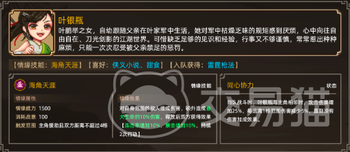 第五位叶银瓶,她是叶家之女,玩家在无名小村的客栈中可触发叶银瓶的剧情,之后前往衙门与叶银瓶进行切磋,则可提升关系,帮助叶银萍成功捉贼,完成案件的破译,则可直接将叶银瓶拉入到队伍当中,在两人同时完成直捣黄龙一战后,则可消耗三生石结缘,获得叶银瓶的“同心协力”状态和“天涯海角”情缘技能。