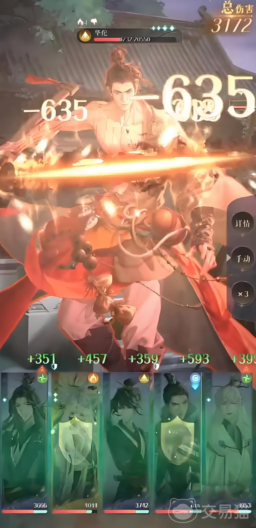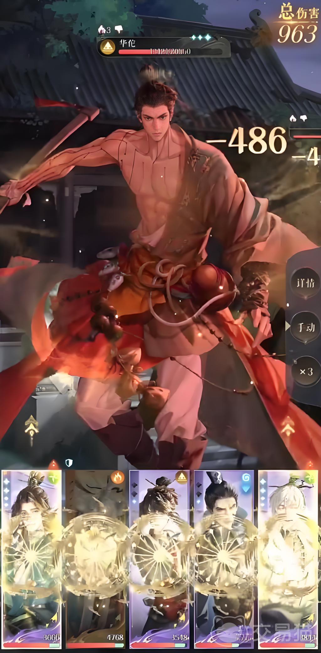第1~2回合的时候,因为双方大招都能量未满,全员选中华佗进行普攻。第3回合颜良和阿蝉开大招,其他人普攻。第4回合颜良发动攻击时可能会吃到杨修的单体大招伤害,血量会大幅度下降。这个时候史子眇要及时放大招给颜良回血。郭解开大招套盾,陈登打配合给队友回能量。第5~6回合,还是选中华佗普攻。第7回合全体放大招,抢血量。第8回合华佗血量濒危的时候,轮流攻击但是阿蝉最后攻击,收割成功后下一轮重复以上步骤即可。