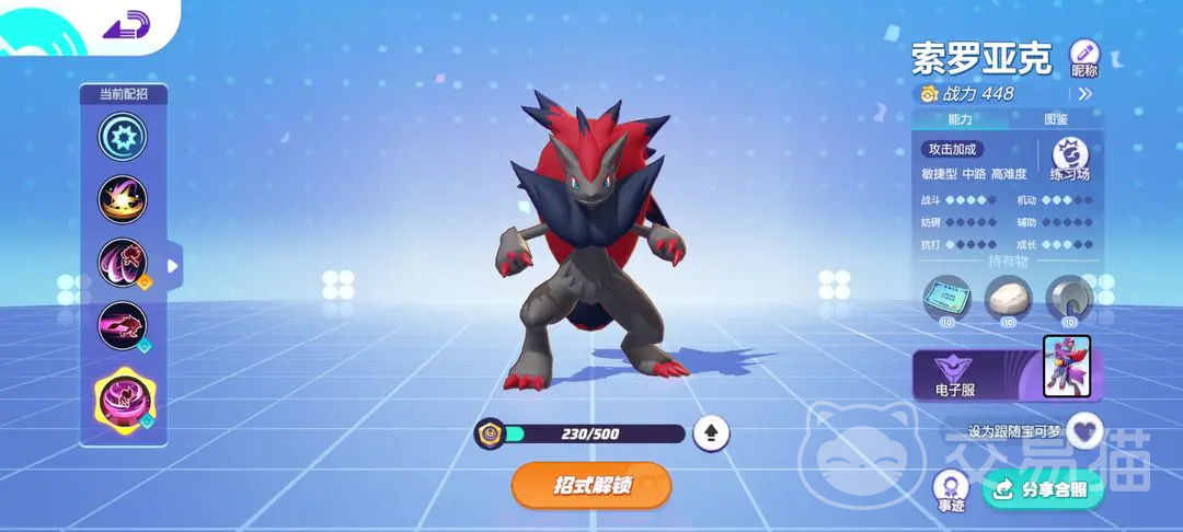 宝可梦大集结索罗亚克怎么玩?它是一只敏捷型的角色,比较擅长近距离攻击和奇袭,经常能出其不意的攻击对手,是一只攻击性很强,机动性也很高的宝可梦,对于这样一个宝可梦的上手难度是比较大的,但是使用好了威力很强,那么本文就整理了关于它的玩法攻略,一起了解一下吧。