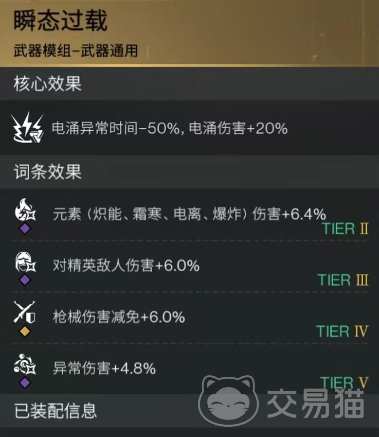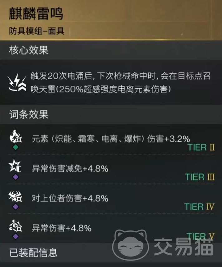 在比较关键的模组方面,武器模组选择瞬态过载,它的核心效果是电涌异常时间减少50%,电涌伤害增加20%,可以将浮游护目镜所带来的伤害降低再补充回去。防具模组方面面具方面可以搭配麒麟雷鸣,触发20次电涌后,下一次枪械命中就会在目标点召唤天雷,以外层空间的射速,触发20次电泳非常简单。头盔上面的防御模组可以选择异常专家或者是元素操纵。手套方面可以选择异常强化或者是元素强化。下身的防御模组选择精准充能,鞋子可以搭配上稳扎稳打,掩护备战或者是隔岸观火等。上半身去选择优势保持,在生命值高于60%的时候,通过击败可以恢复生命值。