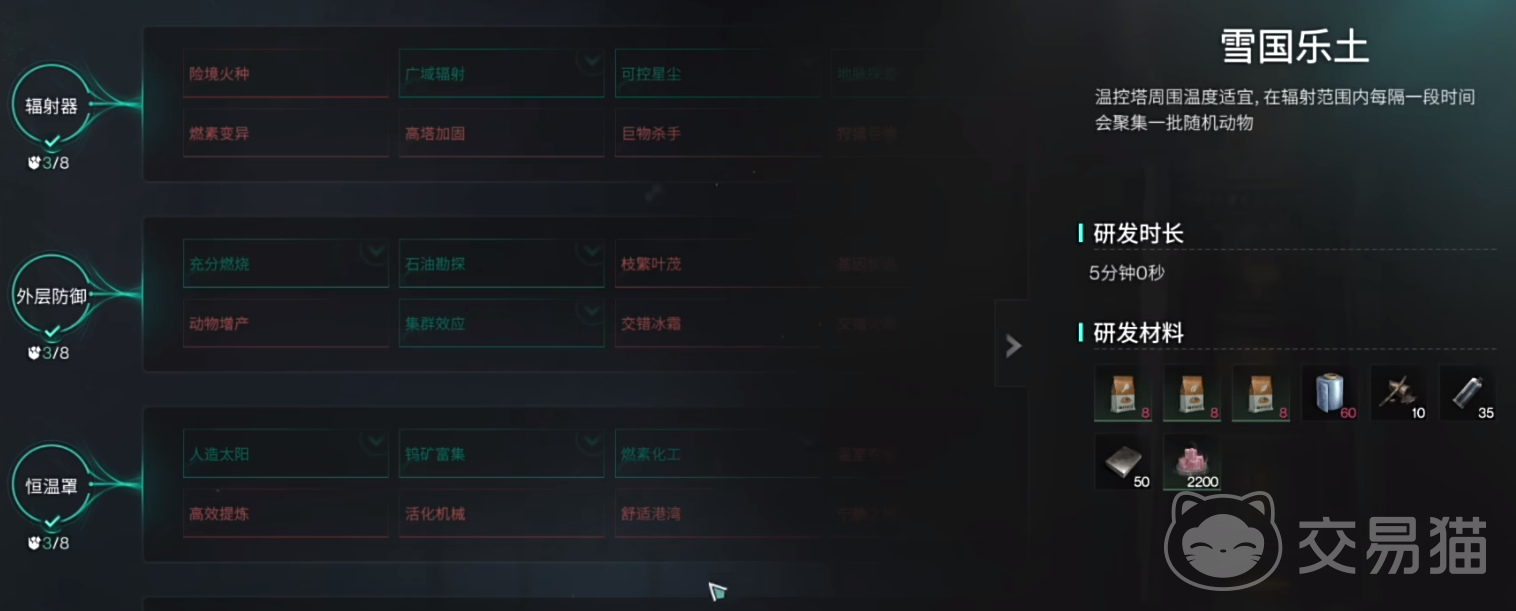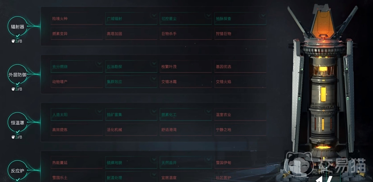 温控塔的科技一共分为4层,分别是辐射器、外层防御、恒温罩、反应炉,每一层共有8个可点科技,总共是32个科技专精,激活研发之后,会让温控塔的功能再进一步。