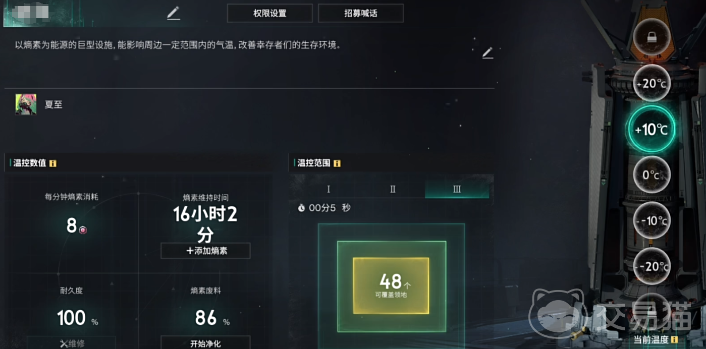 温控塔的装置位置位于雪国地图的科技页面,要通过模因界面点出来建筑。它是以熵素为能量的巨型设施,能影响周围一定范围的气温,并且改善幸存者们的生存环境。玩家可以在温控塔进行温度数值温控范围的调控,如果处于队伍中,队长还能设置更改温控塔的权限,保证队友不乱动数值影响其余玩家。