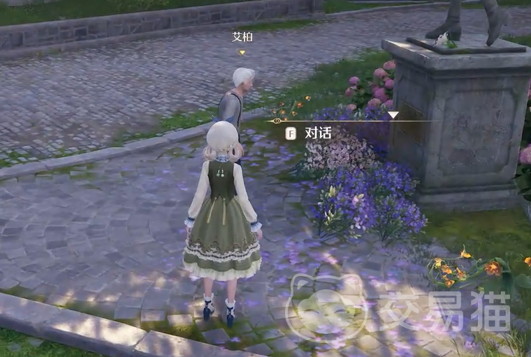 穿戴好裙子后,需要根据地图指示移动到镇长宅邸前方左侧的一个不太显眼的角落。在这里,你会发现一座静默的雕像,而旁边站着一位与众不同的NPC——艾柏。