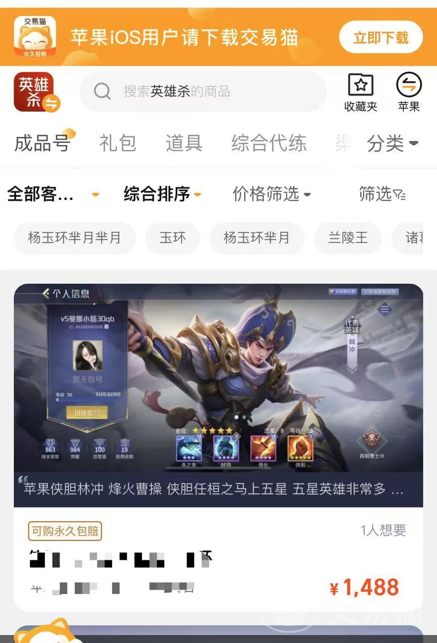 如今英雄杀游戏的热度很高,在交易猫里活跃的玩家数量也特别多。所以这里不会缺少这类游戏号,所以玩家们可以淘到更加便宜并且成色优质的的游戏号,毕竟号多了竞争变大,价格也会低不少。特别是平台还会精选一些优质低价号,让你不需要费力地挑选,就能物色到物美价廉的优质号。