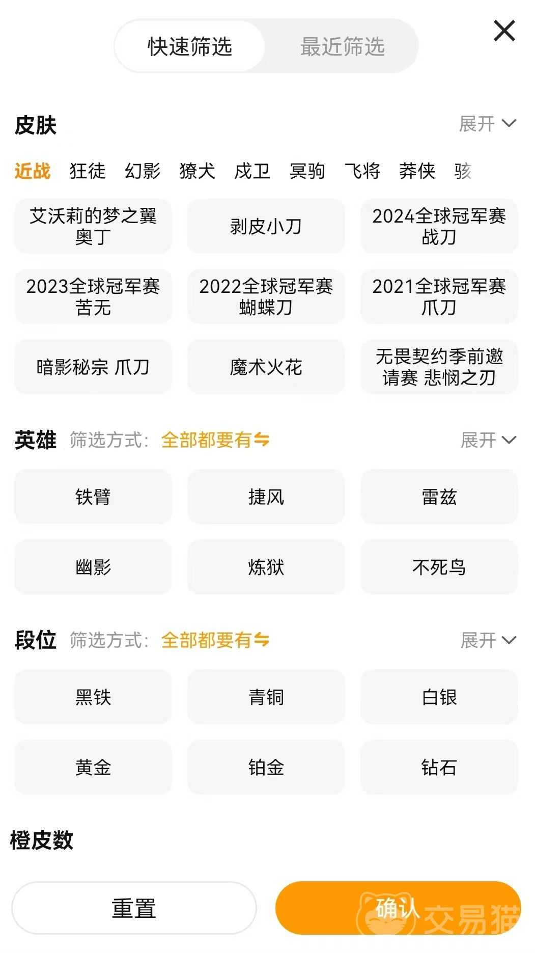 因为无畏契约这款游戏的热度比较高,所以交易猫中也有着海量商品,大家可以通过详细的筛选服务来快速找到适合自己的账号。例如通过皮肤来选择自己想要的各种皮肤,还有相应的英雄以及账号所属的段位,橙色皮肤数量,英雄数量等,都可以输入进去,这样快速完成筛选。此外还能够进行价格方面的选择与排序,这样符合要求的账号中性价比较高的就可以更好地展现出来,不需要大家再逐步的去查看了。