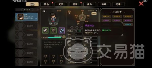武功体系,使您可自由组合功法,创造自己战斗风格。例如在学绝世剑法的同时可练内功心法而成攻守兼备之全才;还能集中精力于某类武功成为极致剑客或者拳师。