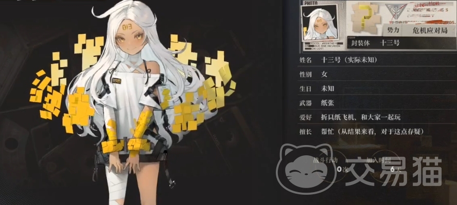 十三号是一个以人类少女形态稳定存在的异象实体,拥有着不一样的效果,每当回合开始时,如果十三号没有护盾保护,她将自动回复自身10%的最大生命值。这一特性使得她在战斗中具有了极强的生存能力,能够在关键时刻迅速恢复战斗力,而她的主动技能使用后可以对目标造成两次70%的物质伤害,并且附带束缚效果。这种束缚效果可以让敌人在接下来的一个回合内无法移动。
