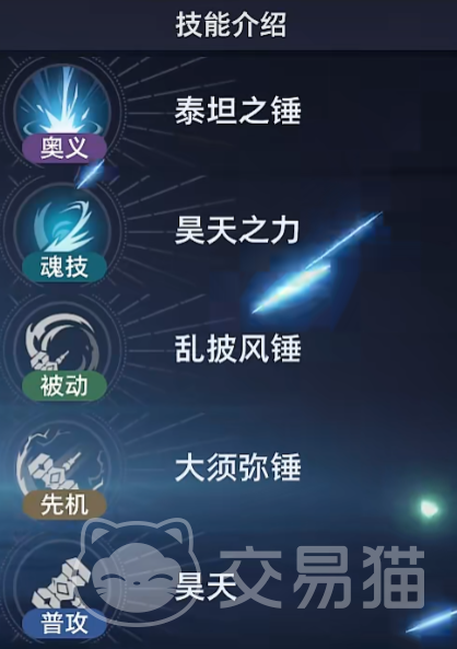 有了他之后,便可获得乱披风锤的被动。如果攻击没中断的话,那么就会积攒增加伤害的buff,到了后面伤害就越高。魂技叫做昊天之锤,能够召唤一名硕大的锤子砸向前方,并造成范围伤害,奥义技能做泰坦之锤,有着很高的爆发伤害,能够将硕大的锤子幻化出来,并给予敌人致命一击。