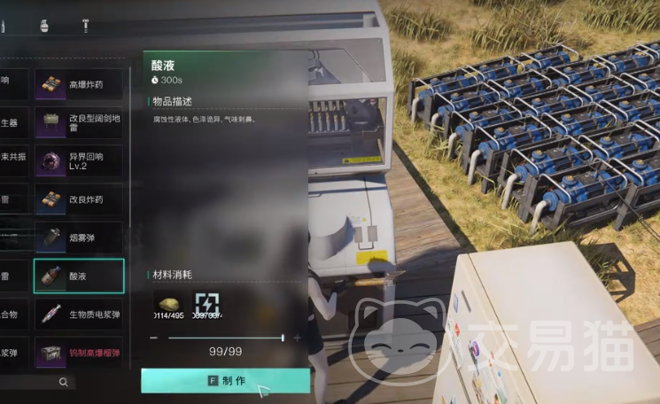 之所以在游戏里要制作酸液,是因为这是制造火药子弹以及铝材的重要材料,有了这些材料之后才能打造出一些比较高级的装备和武器,另外就是酸液还可以在游戏里生产便携式的混合燃油,适合在探索场景的时候去使用,想要在这个世界中生存下去,酸液是必不可少的。