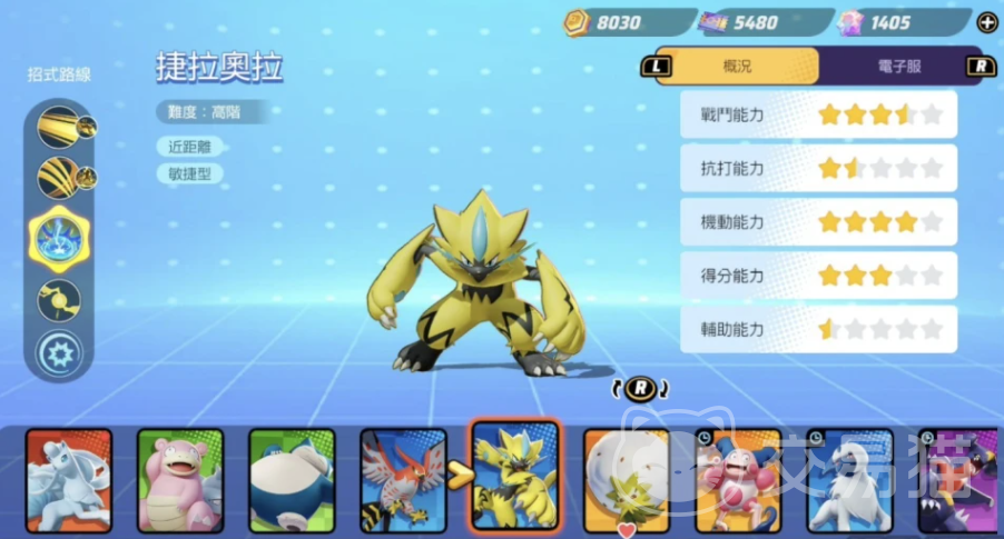 捷拉奥拉这只电系宝可梦在T0级绝对算得上明星了。其不但基础攻击力强,而且位移速度更是首屈一指,使得其战场打野能力无出其右。捷拉奥拉技能设计使其很适合单兵作战使用,特别是在单体目标面前爆发伤害可以说是非常可怕。如果你喜欢秀上作战中的操作的话,捷拉奥拉无疑是一个不错的选择。