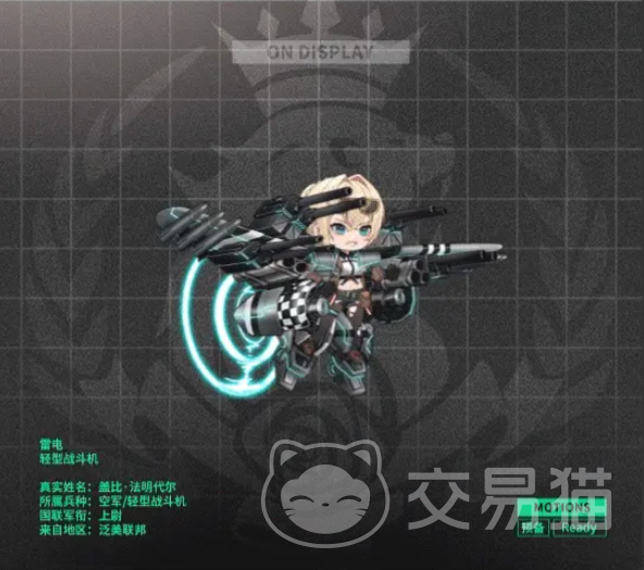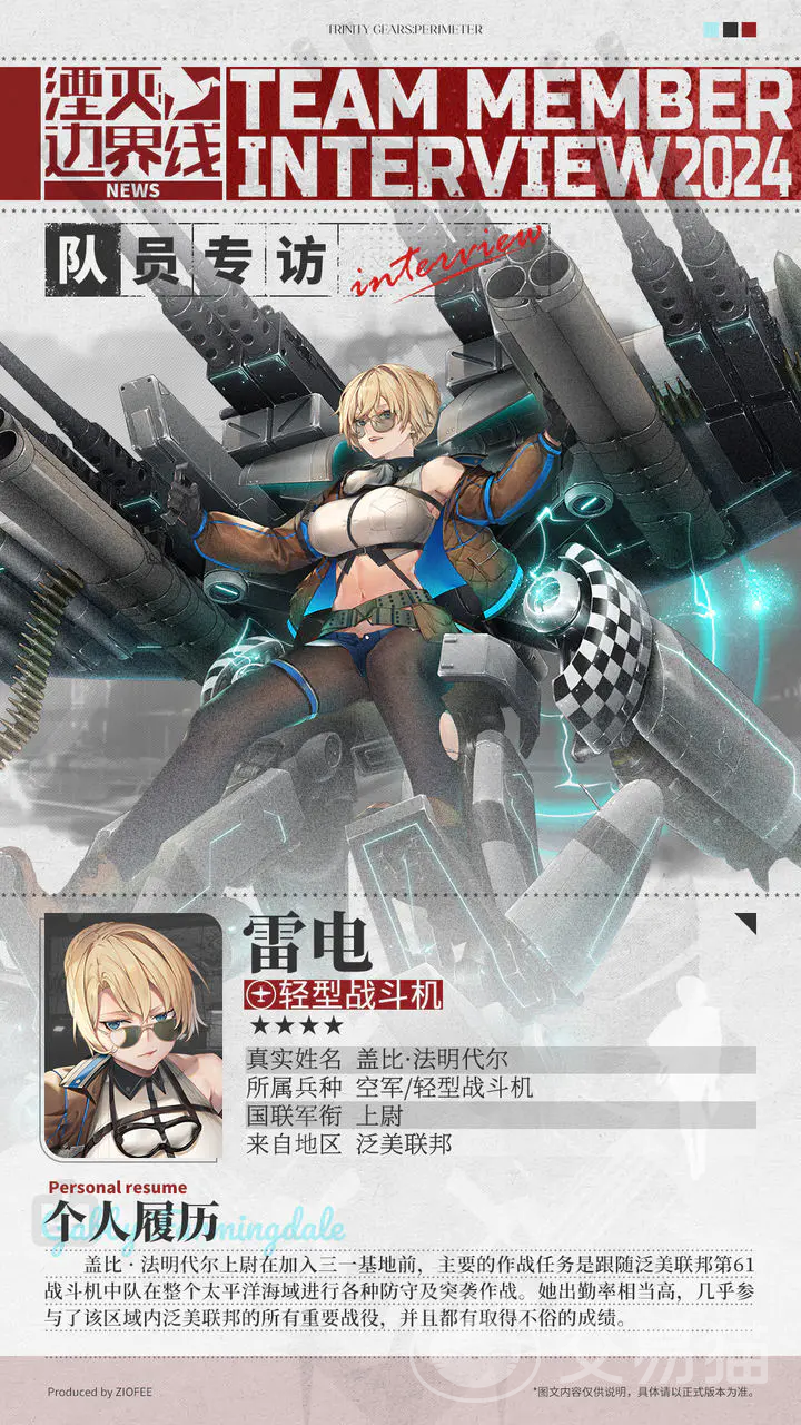 雷电驾驶轻型战斗机,是一个四星角色。通常技“雷电掠袭”,装填“M20多用途弹”,往选择的方向发起冲锋,同时达到范围内最远的格子,对途经所有敌方空中单位造成火力分摊伤害,技能达到最高等级状态时,会给敌人添加“燃烧”状态。装填的子弹可以让穿甲效果提高20%,同时无视目标的“隐匿”以及“闪避”手段;