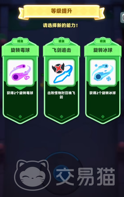 每次提升等级后都可选择一个新的能力加成,比如旋转毒球,可以获得两个不断旋转的毒球,帮你攻击周围敌人。虽然变强了,但是后面出现的怪物也越来越难缠。例如大型史莱姆,被击败后就会分裂成几个小的史莱姆。通过后便可继续选择新的能力,紫色能力更强。例如斜向箭,可发出两发斜向的箭矢。