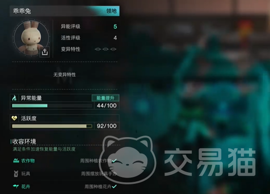 乖乖兔在游戏中是一个采集资源为主的异常物,技能是采集灌木,在激活这个技能之后,乖乖兔可以自动对周围的灌木进行采集,如果在异常能量大于30的时候会自动进入工作状态,采集的过程中也能够自动采集蔬菜水果的种子,游戏中可以帮助玩家快速的采集各种资源,工号37是一个探索类型的异常物,技能是探索者,激活之后可以在地图中探索不同地方的宝箱,并且评级越高,宝箱的奖励也就越好,可以帮助玩家更快的获得各种特殊的物资,在战斗的时候也可以使用收音机播放音乐,或者在附近摆放玩具的方式来恢复自身的能量,各方面使用都非常的实用。