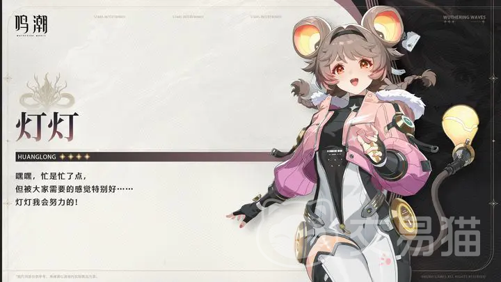 还有一个四星角色则是“灯灯”,这是一个和椿不同类型的角色,从立绘看来她非常的可爱,灯灯是一个四星的长刃角色,有两个非常可爱的老鼠大耳朵,对敌人主要造成导电伤害,在对敌人的伤害倍率以及效果方面都非常不错。
