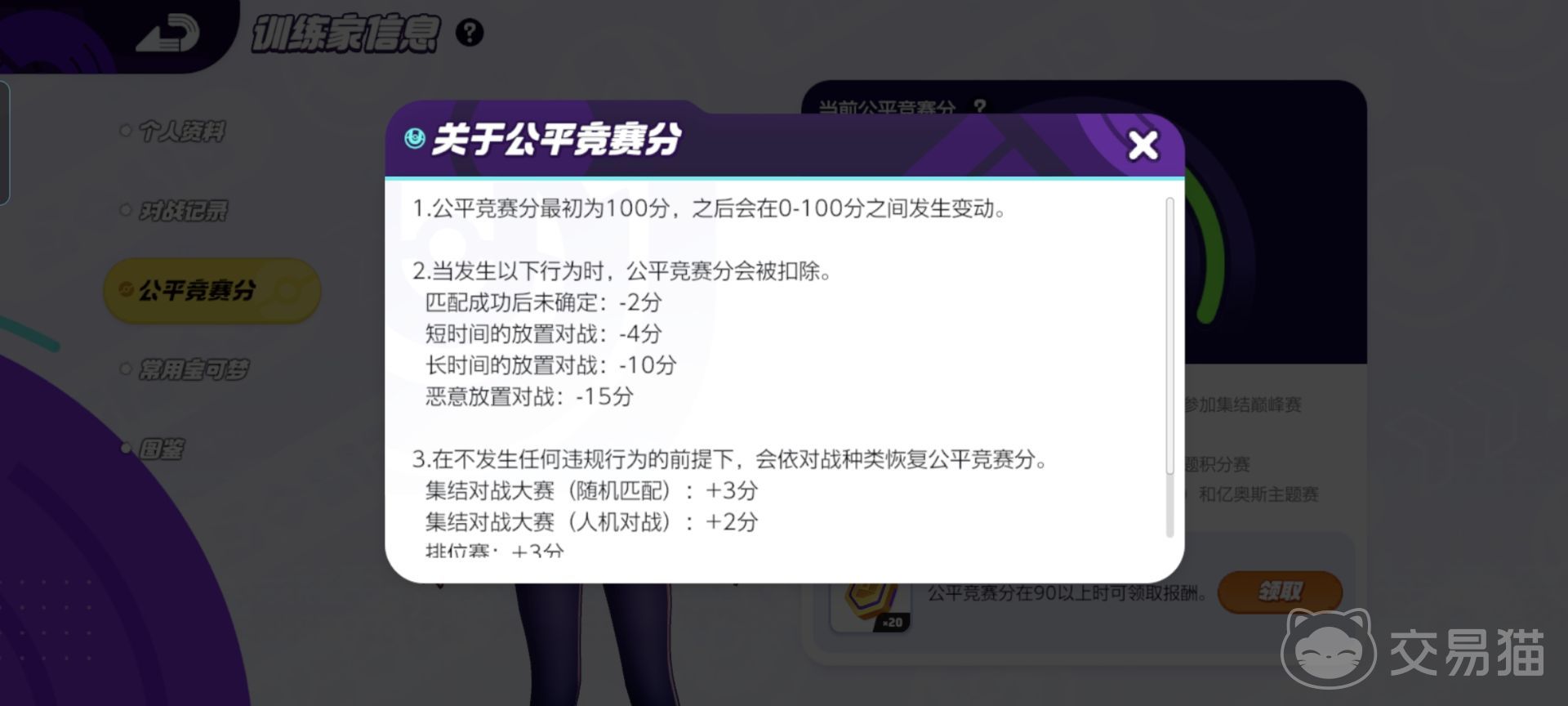 宝可梦大集结这款游戏之所以如此的受到玩家们的喜爱,不仅是因为这款游戏是一款5v5的竞技类型游戏,更是因为这款游戏是一款可以让玩家在竞技时感受到十分公平的游戏,宝可梦大集结公平竞赛分在游戏里面是一个非常重要的衡量标准,有了这个标准就可以衡量出玩家是否符合竞技的条件,那么宝可梦大集结公平竞赛分的规则到底是什么呢?为了让大家在竞技时不触犯竞技规则,下面小编就来给大家详细的介绍一下宝可梦大集结公平竞赛分的相关规则吧。