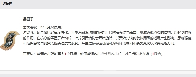 信标的名字是艾菲米娅·胡弗,原本的身份是一名学生,她在遭遇异象事件之后参与了考核,顺利地成为了对策室的成员之一,这个角色性格上非常喜欢飞行,所以在封装体上也与飞行有关,她的封装体是一个飞行记录仪,外观上非常类似羽毛,而且可以当做盾牌来使用,然而由于危害等级较高,在游戏中设定中是受限制的,所以这个角色本身的强度自然也是不错的。