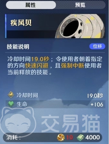 疾风贝有超强的位移与中断机制,19秒的冷却时间,可以带来一次精准闪避,无论面对何种攻势,使用者都能借助疾风贝的力量,朝着预定方向瞬移脱险,甚至打断自身正在施放的技能,很多的对战当中都用得上。