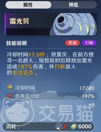 然后是雷光贝,同样拥有17秒的冷却时间,雷光贝能在战场上部署一枚定时引信,静待最佳时机引爆,释放出耀眼的雷电之光,直击一名不幸的敌人,造成高达197%攻击力,而且这道光芒还能打断敌人的专注状态,使其在短时间内无法施展强力技能,为己方创造反击或逃脱的宝贵机会,对于那些擅长控制战场节奏、善于捕捉战机的角色而言,雷光贝是最理想的选择。