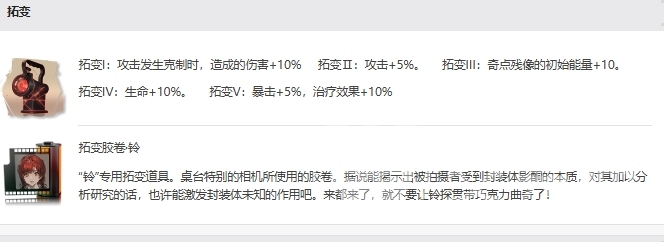 此外铃还拥有激励技能,可以为目标回复相当于攻击180%的生命值,如果目标不是铃自身,那么这个目标还将获得5点能量,激励技能不仅可以作为紧急治疗手段,为受伤的队友回复大量生命值,还可以通过为队友提供能量,帮助团队更快地使用技能,特别是在能量紧张的情况下很管用,其次奇点残像作为铃的第二个主动技能,独特的扇形射程为前方3格范围内的己方单位提供了相当于攻击100%的护盾,这个护盾的效果会持续2回合都生效当中。