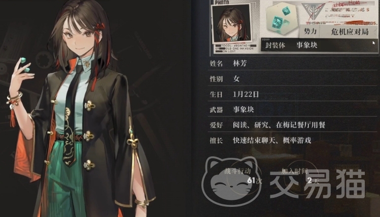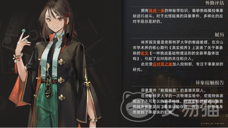 设定上面林芳曾是密斯特罗大学的客座教授,她在期刊上发表了一篇关于事象块的论文,这篇论文引起了应对局的高度关注,应对局对林芳的研究产生了浓厚的兴趣,并邀请她加入控制部,专注于事象块的研究,而在游戏中,林芳作为一名探员,对实验数据进行复查时发现了事象块的存在,这一发现不仅让她受到了事象块的影响,还使她获得了操控事象块进行战斗的能力,这一点是也是体现在她的封装体效果上面。