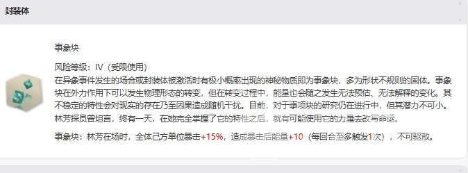 林芳的封装体事象块虽然风险等级为IV,属于高风险物品,但其实危险程度越高,能够带来的效果就越大,上面说到的事象块是一种在异象事件发生或封装体被激活时有极小概率出现的神秘物质,通常呈现为形状不规则的固体,因此非常不稳定,在游戏中只要林芳在场,全体己方单位的暴击率就能增加15%,随着游戏的推进,这种效果还能带来能量回复,为队伍提供持续的支持。