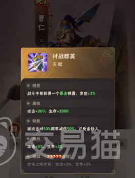 虎卫:如果将武将提升到十星,可以把曹仁更换成典韦或者是张飞。典韦偏向于肉盾,有护盾有天赋,而且免伤效果比较高。张飞偏向于输出,但是肉盾效果相对比较差一些,要想伤害比较高,可以选择张飞。