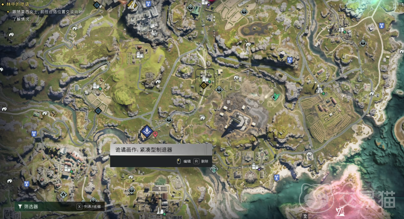 代顿湿地的诡谲画作位于代顿湿地的传送锚点周围,玩家只需要前往传送锚点左边的台阶下,即可找到,在触发成功诡谲画作共鸣之后,玩家立即前往望岛镇,跟随着诡谲画作任务的引导,寻找到异常点发光处,再次和诡谲画作交互,即可开启宝箱。