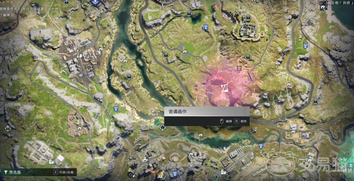 诡谲画作在游戏中总共有六个,这类的宝箱都有特殊机制,玩家必须要触发诡谲画作的特殊任务后,才能够获取宝箱,这六个诡谲画作分别分布在,代顿湿地、破碎三角洲、铁锈河、垩峰山、孤狼荒原、黑心地带,如若玩家想要全部解锁这些诡谲化作,则需要率先保证自己的异常属性值达到三十点以上,此时才能够和这些诡谲画作进行共鸣。