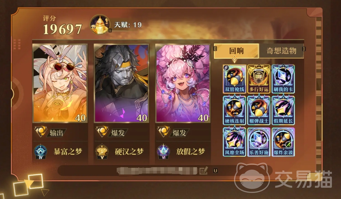 作为连珠角色的暴富之梦,如要组三连珠流也是十分合适的,玩家们可将暴富之梦与硬汉之梦、放假之梦进行搭配,让三个角色都能吃到通用的连珠回响加成。再加上硬汉之梦和放假之梦都是能打完爆发就切下场的角色,也不会抢夺暴富之梦的站场输出空间。