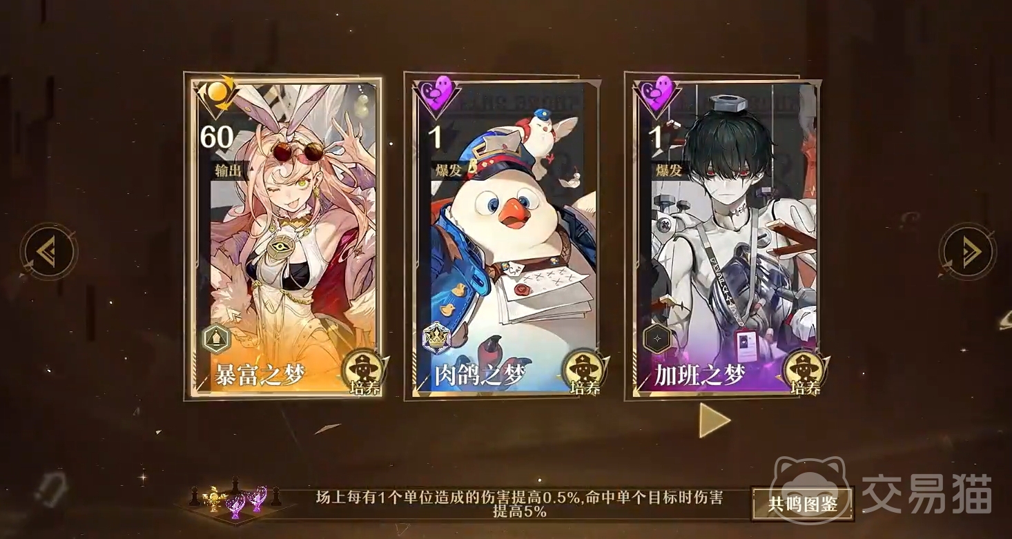 养鸡流是很多人常用的阵容搭配方式,由暴富之梦、肉鸽之梦和加班之梦共同构成,其核心就是利用暴富之梦的高频输出配合伤肉鸽之梦的召唤小鸡来打出高爆发,是开荒时很好用的一套组合,而且在有加班之梦与肉鸽之梦的情况下,暴富之梦也不容易暴毙。