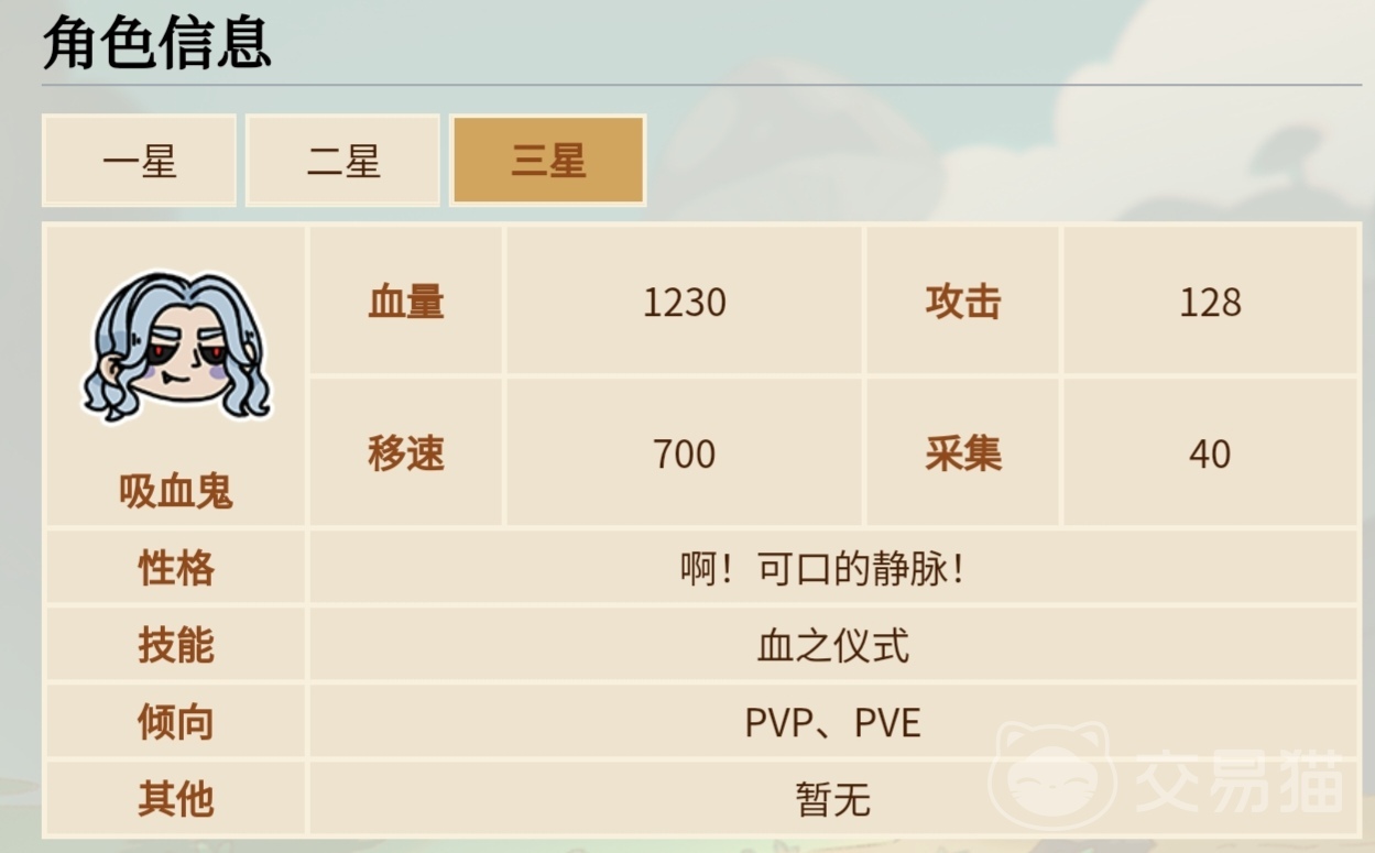 一星的吸血鬼血量仅有900、攻击伤害为95、移动速度也只有700,而他的采集能力最低才40点,虽然一星的吸血鬼能力并不出色,可是当他升到2星和3星的时候,他的血量以及攻击力都会大幅度的提升,当角色升级到2星时,血量从原本的900一下子提升到了1020、攻击力也从95升到了107,等星级到了3星以后,血量将会提升1230、攻击力也会升到128,从这一点来看,吸血鬼这个角色还是比较不错的。