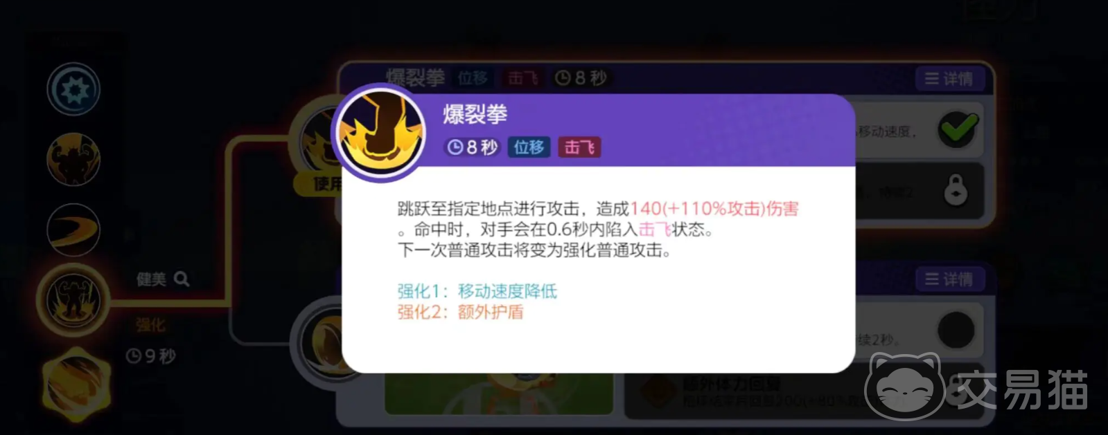 怪力的二技能可以替换成爆裂拳或深渊翻滚,爆裂拳是跳向指定地点,对敌人造成伤害和击飞后让下一次普攻变为强化普攻,深渊翻滚使用后会进入妨碍无效状态并提升70%移速,下次普攻会抱起对手造成伤害和无法动弹效果后,将其摔到地面造成二次伤害。