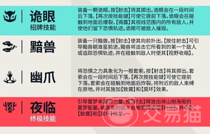 诡眼在触碰到地面后会爆裂,揭露起视线范围内的所有敌人,并使其留下恐惧轨迹,但需要注意的是,这个诡眼是可以被摧毁的,无论是进攻方还是防守方都可以使用这个技能,它主要用于侦查,然而在投掷时需要注意将其投掷在难以发现的角落,或者最好是直接快头快落,直接揭露敌人的位置,以免技能成为无用功,第三个技能是黯兽,玩家可以按住射击键使其向前扑出,然后再次按住射击键可引导黯兽朝准心前进。