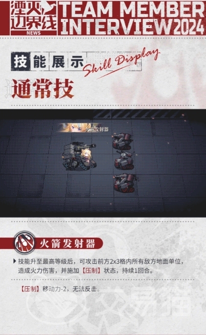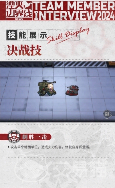 通常技方面她擅长使用火箭发射器进行攻击,这项技能可以对前方2x3格范围内的所有敌方地面单位造成60%的火力伤害,并且对这些非重型单位施加压制状态,持续1回合,压制状态下的敌人移动力将减少2点,并且无法进行反击,这使得潘兴在战场上能够有效地限制敌人的行动和输出,而在决战技方面她拥有一项强大的技能叫做制胜一击。