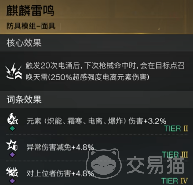 因此在模组方面,推荐选择瞬态过载,可以进一步提升电涌伤害。防具模组头盔则可以选择异常专家,面具选麒麟雷鸣,裤子选异常增幅,手套选异常强化,裤子选稳扎稳打,衣服则可以随意看副词条选。