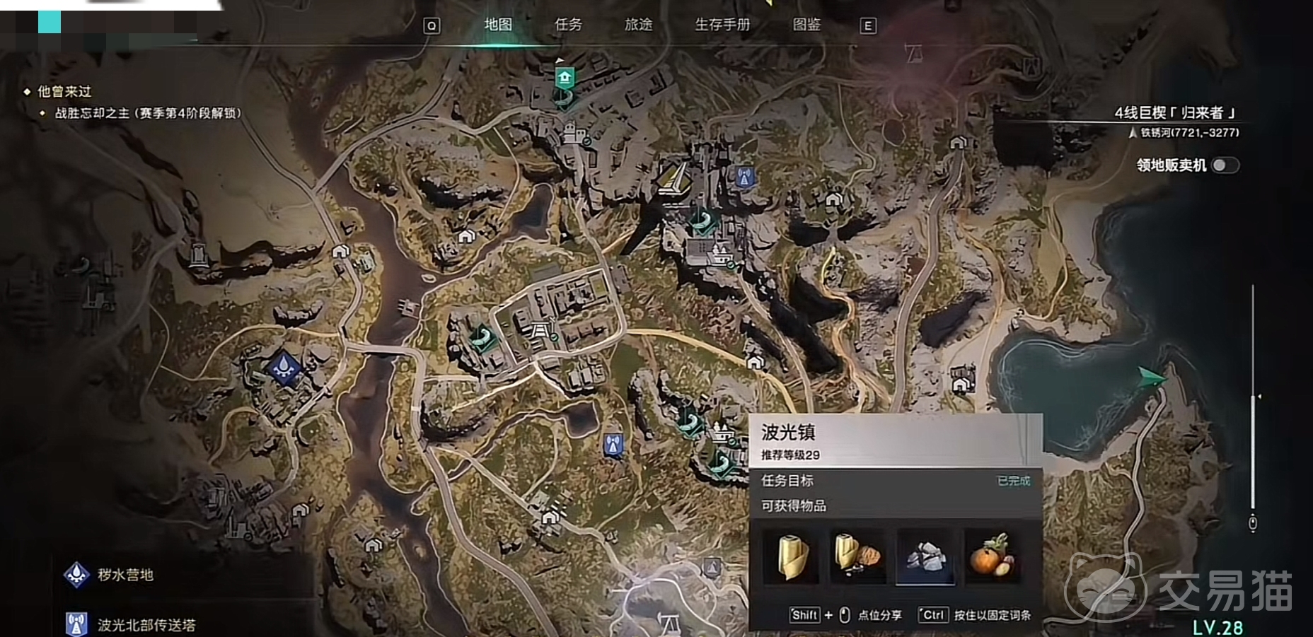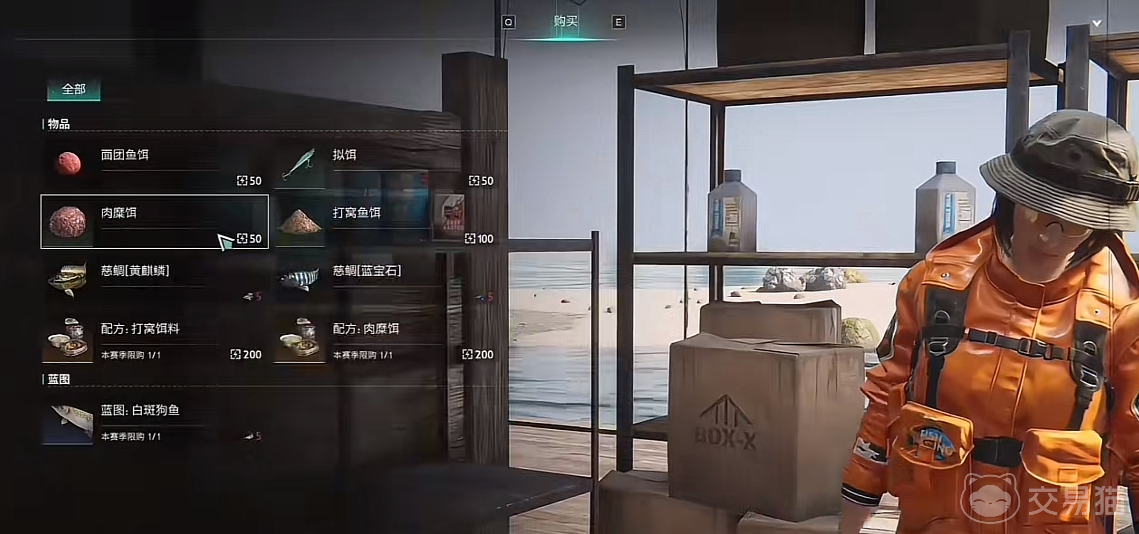 打开地图,点击地图右下角一个叫波光镇的地方,这个小镇的右上方有一个月牙形状的海湾,在海湾这里找到马德林,和他对话进到商店之后,直接购买30个肉糜饵,一共是花费1500个电。然后转身随便选择三个钓鱼台的其中一个,这里面只会产生两种鱼,一种是梭鱼,另外就是至少阶段品质为3-3的电鳗。