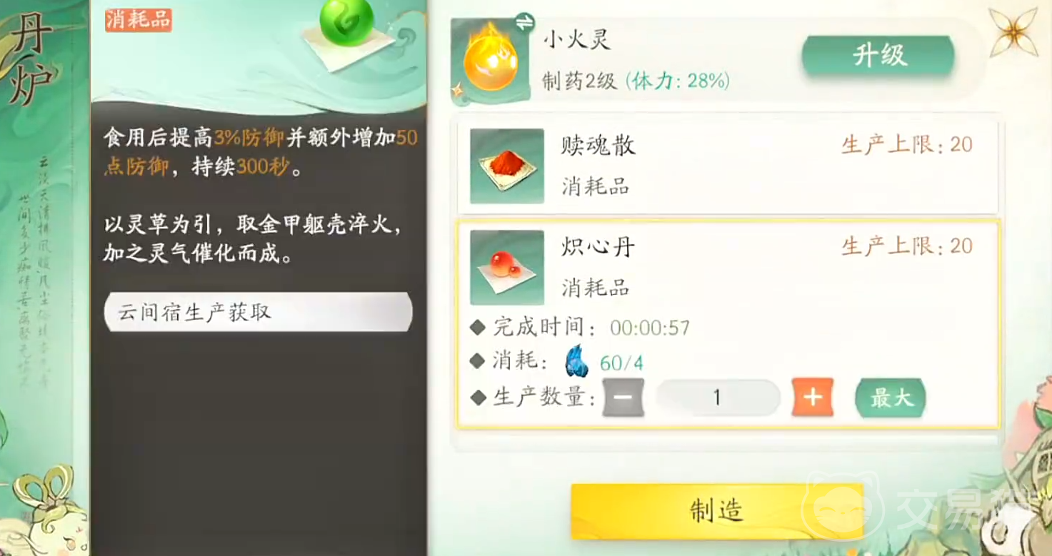 如果玩家想要提高生产效率,那么必须优先升级这个,它升级的越高玩家能安排干活的精怪数量也就越多,小屋中的单炉是我们生成丹药的主要来源,可以生产防御攻击药品,和回血药品。