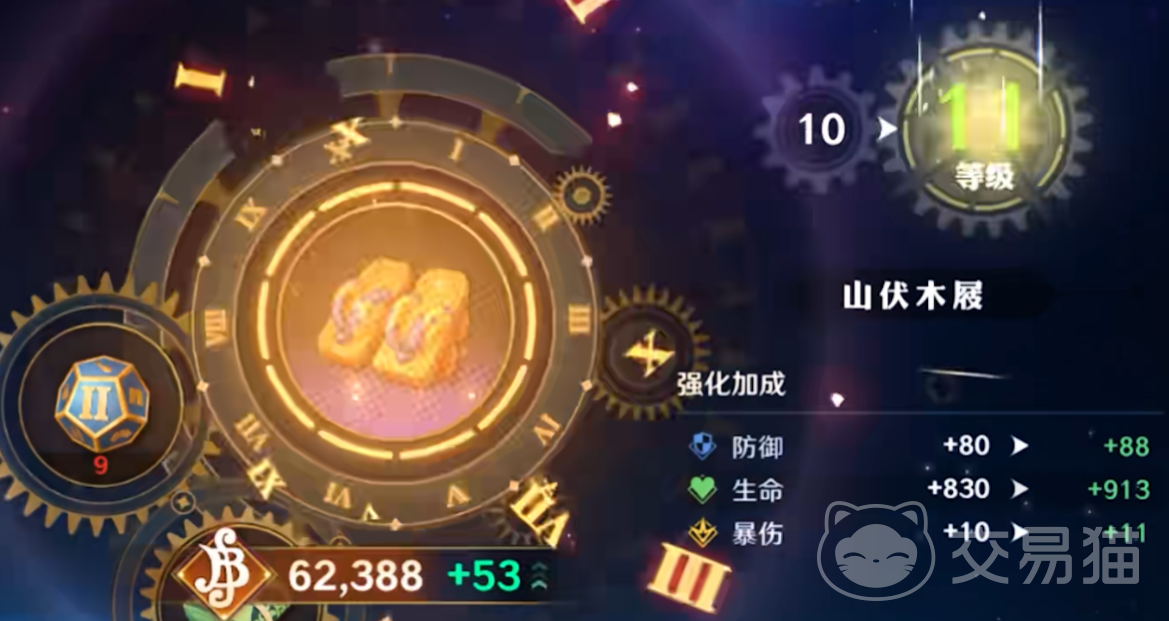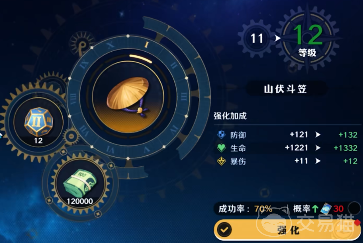 显而易见这是一件帽子,佩戴之后同样可以获得属性加成。例如增加数百点的防御力,并增加1000多点的生命值。然后又能增加点爆伤,具体的属性增幅数值还要看等级。想要强化的话需要消耗材料,并有概率失败。