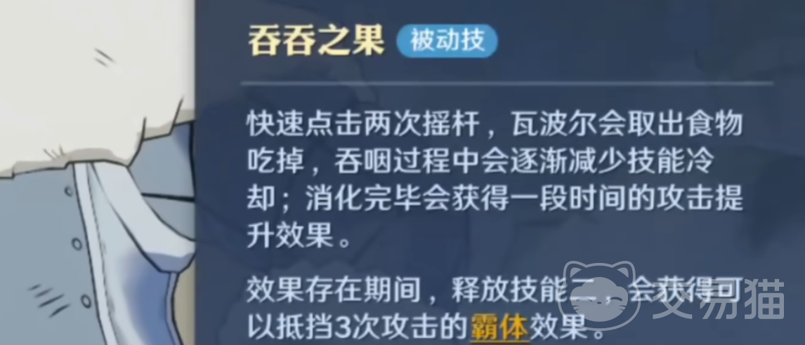 瓦波尔的核心技能是吃鸡腿,这是一个被动技能。当你迅速点击两次摇杆时,他就会从口袋里掏出粮食并迅速的吞掉。吃完之后非但可以减少技能冷却时间,在消化完之后还能短暂提升自己的攻击力。这是一个很重要的key,我们能在战斗中合理利用。