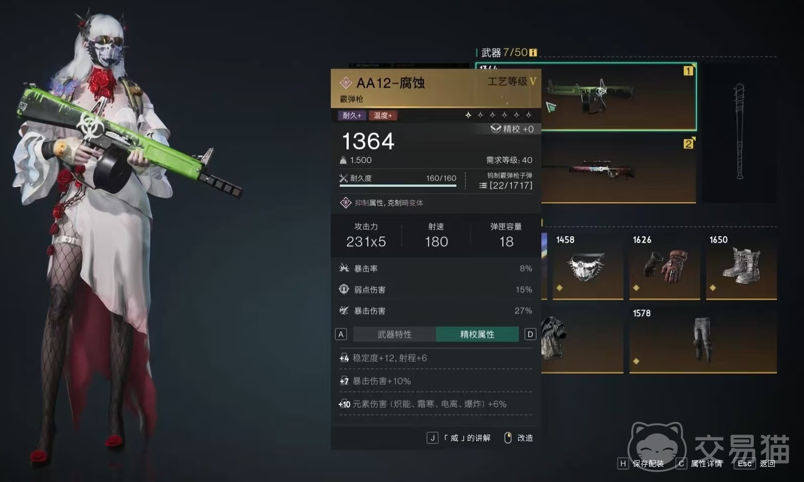 在为腐蚀这款武器进行配装之前,大家需要先了解武器的特点,腐蚀的全称为aa12腐蚀,是一款速射风格的霰弹枪,具有8%暴击率,15%弱点伤害和27%的暴击伤害等属性。这款武器配备大容量弹鼓,可以以较高的射速连续进行发射,非常适合进行近距离作战,只要大家反应够快,可以快速消灭近距离的敌人。