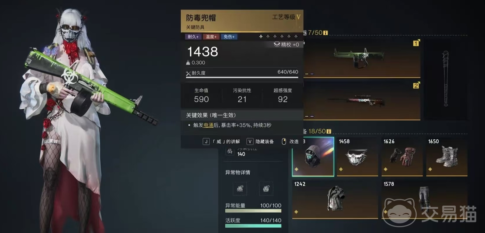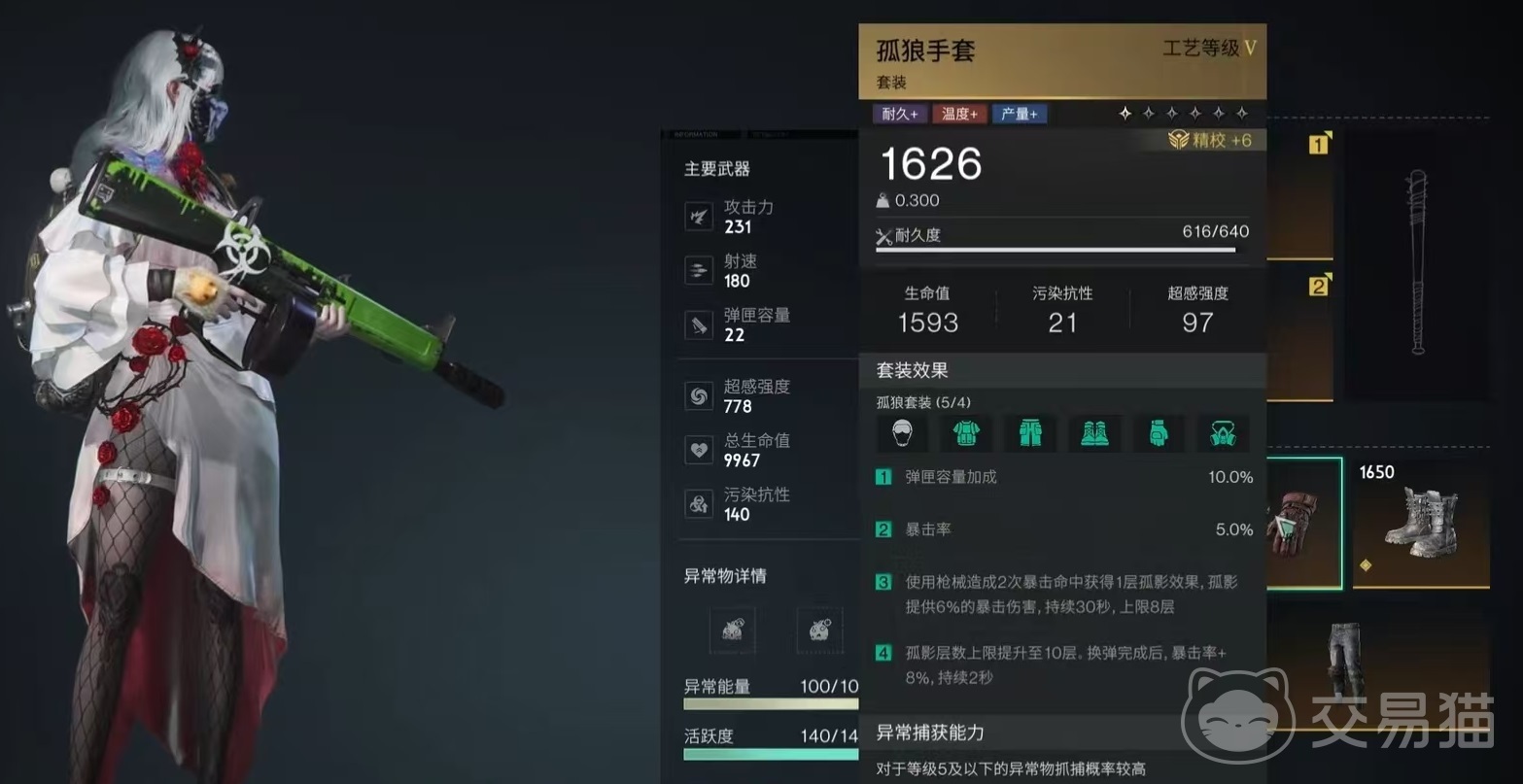 在防具方面,头盔一定要选择防毒兜帽,它的关键效果是触发电涌后暴击率提升35%,持续3秒,本身腐蚀就是依靠电涌来打伤害的,这样触发之后就提高暴击,近战输出更为可观。剩余的5个部位,选择4个部位带上孤狼套装,一个部位带堡垒,也可以选择三个部位带孤狼,两个部位带拯救,这样的搭配都是可以的。只要将头盔留给防毒兜帽,其他的位置可以随意更换。之所以要重点选择孤狼套装,是因为孤狼的套装效果很合适腐蚀,例如带4件套时,孤影层数上限提高到10层,换弹完成后暴击率增加8%,持续两秒钟。三件套的效果是使用枪械造成两次攻击命中可获得一层孤影效果,孤影能提供6%的暴击伤害加成,持续30秒钟。