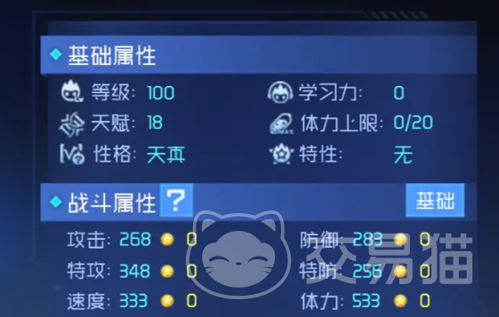当你将起升至100级之后,就可以获得18个天赋点。他的性格十分天真,很克制一些邪恶类型的精灵。然后战斗属性方面,有着高达268点的攻击力。然后特攻也高,另外双防处于正常水平。自身的速度较快,有着足够多的体力,在频繁的战斗中不落下风。