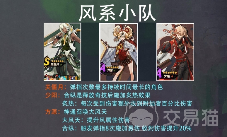 风系小队有着灵动和速度上面的优势,在这个队伍中,关偃月作为核心角色,拥有着弹指次数最多且持续时间最长的特点,能够在战斗中持续不断地对敌人造成伤害,少阳则是队伍中的辅助高手,他的合纵技能在释放奇技后能够施加炙热效果,使得每次受到的伤害都会额外增加附加者的百分比伤害,提升了队伍的整体输出能力。