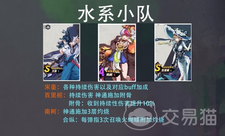 最后的水系小队持续伤害能力是它们的核心效果,其中的宋墨是这个队伍的灵魂人物,他擅长各种持续伤害技能,并且能够施加对应的buff加成,百里栀则有着独特的神通技能,她能够施加附骨效果,使得受到持续性伤害的敌人伤害提升10%。