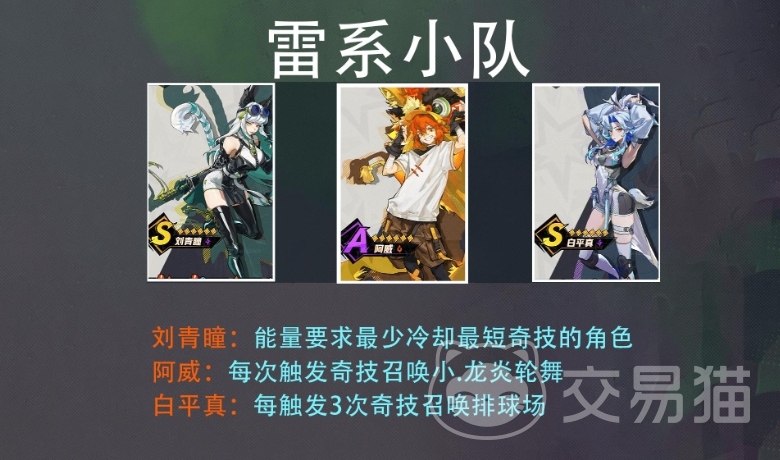雷系小队有着超强的迅猛输出和爆发力,在这个队伍中,刘青瞳无疑是核心角色,他拥有能量要求最少、冷却时间最短的奇技,能够在短时间内频繁释放技能,对敌人造成持续的打击,而阿威则是队伍中的召唤大师,每次触发奇技时都能召唤出小·龙炎轮舞,这些龙炎轮舞在战场上穿梭,对敌人造成额外的伤害,白平真则以其独特的召唤能力著称,每触发3次奇技便能召唤出排球场,为队伍提供强大的辅助和控制能力。