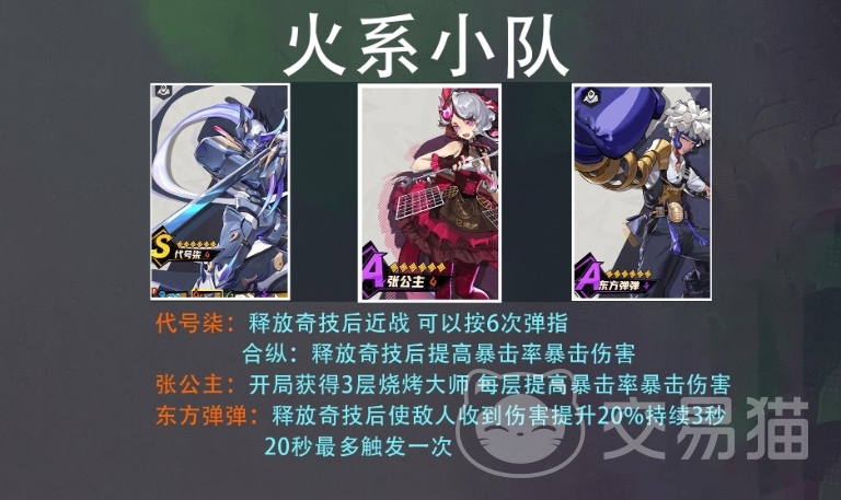 开局时张公主便能获得3层烧烤大师状态,每一层都能提高暴击率和暴击伤害,这增强了她自身的战斗力,也为队伍中的其他成员提供了额外的输出加成,而东方弹弹则是控制角色,他的奇技能够释放后使敌人受到的伤害提升20%,持续3秒,并且这个效果在20秒内最多只能触发一次,这个火系小队也是很多新手玩家的首选之一,无论是代号柒的近战爆发、张公主的稳定增益还是东方弹弹的控制能力都是能够用上的。