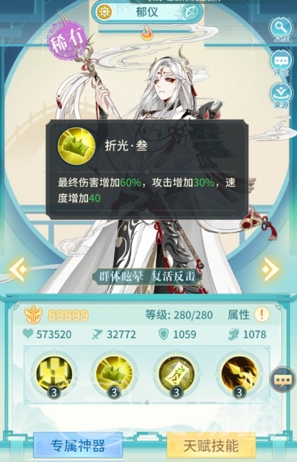 不仅如此,此技能还有60%的概率使目标进入眩晕状态,能够持续2回合,在这个生效时间之内限制了敌人的行动能力,如果目标的生命值低于30%,则会受到额外的200%攻击力伤害,这一特性使得郁仪在对抗残血敌人时具有极强的收割能力,接下来是折光·叁技能,它为郁仪带来了属性提升的效果,在技能激活后,郁仪的最终伤害将增加60%,攻击力提升30%,速度加快40%,这些增幅让郁仪在无论是先手控制还是快速清理战场的时候都有加成。