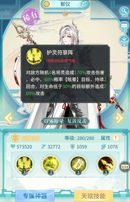 而金乌神木则是另一种产出碎片的重要途径,玩家可以通过完成各种任务、挑战或是参与特定活动来赢得碎片奖励,而在效果上面他的技能其实也是能够带来多效果的,首先是护灵符篆阵,这项技能是郁仪的核心输出手段之一,当使用该技能时,郁仪会消耗100点怒气值,对敌方随机4名将灵造成高达170%攻击伤害的必中打击。