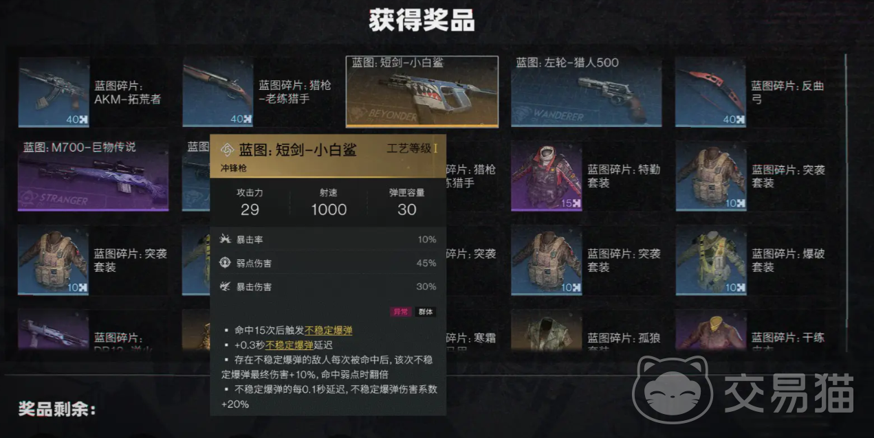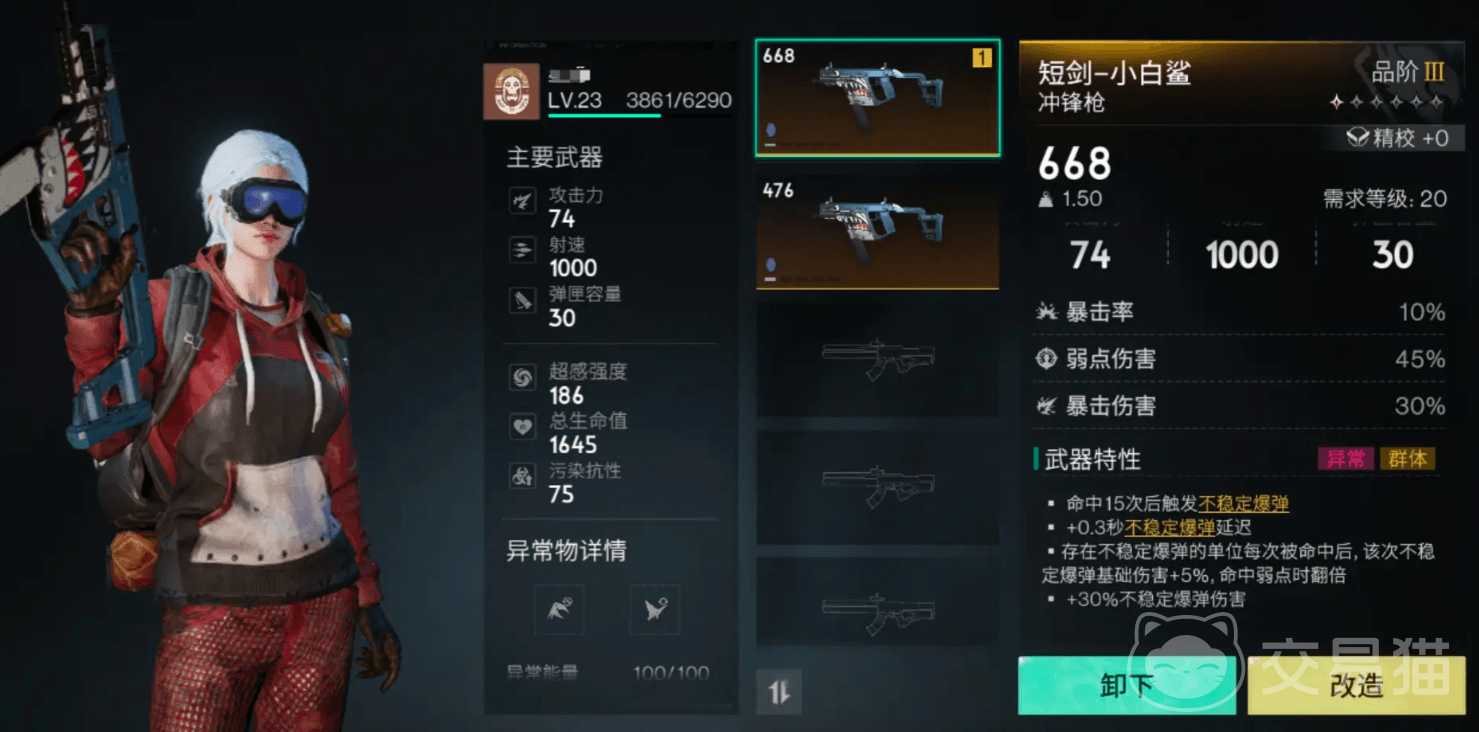 小白鲨属于短剑系列的,它的射速为1000,弹匣容量是30,它还拥有三个特性,第一个特性是在成功命中敌人后触发一次不稳定爆弹,第二个是加0.3秒不稳定爆弹的延迟,最后一个是存在不稳定弹匣的敌人每次被命中后,不稳定爆弹系数加20%。